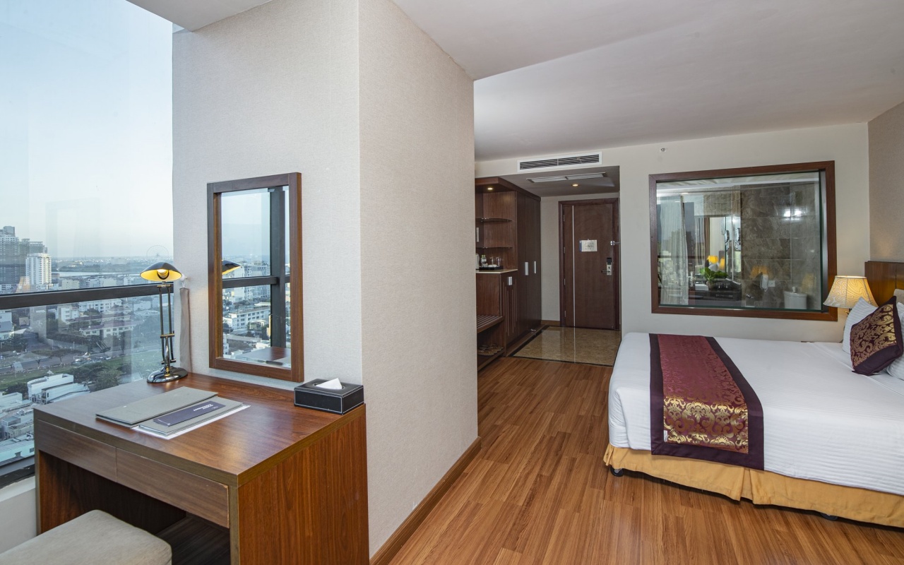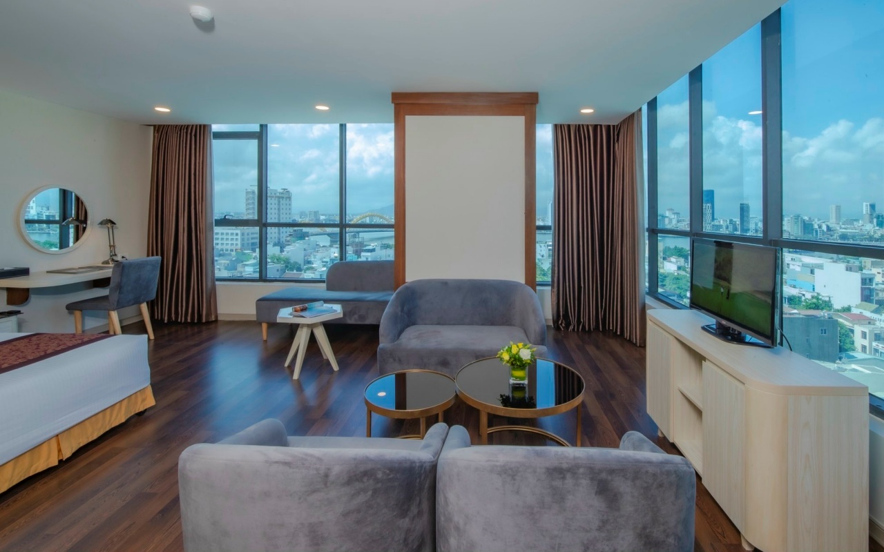 Không gian phòng được thiết kế tinh tế với gam màu trầm ấm, trang thiết bị đạt chuẩn 4 sao. Cửa sổ lớn nhìn thẳng ra sông Hàn tạo nên một khung cảnh vô cùng thư giãn.
