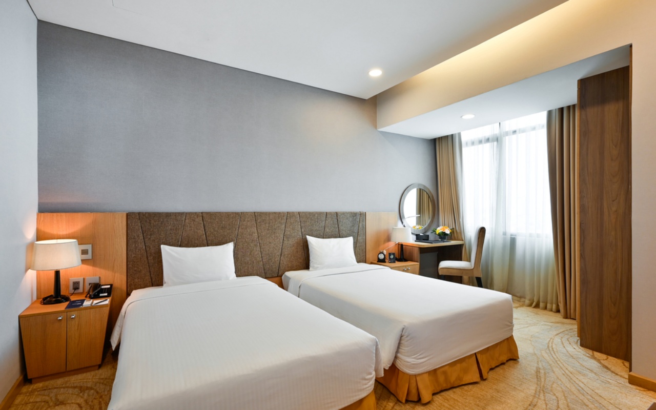 Phòng được thiết kế gọn gàng, hiện đại với hai giường đơn, phù hợp cho khách công tác hoặc nhóm bạn.
